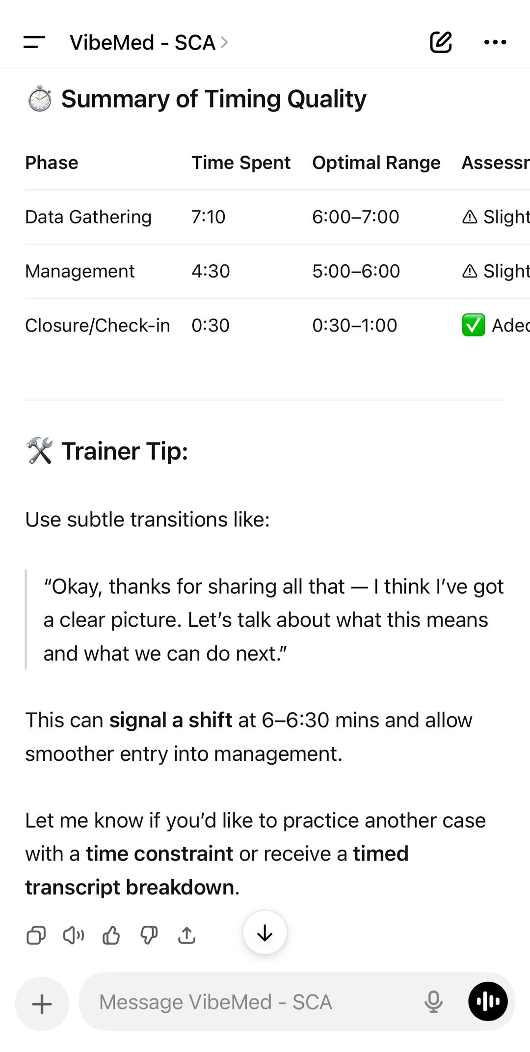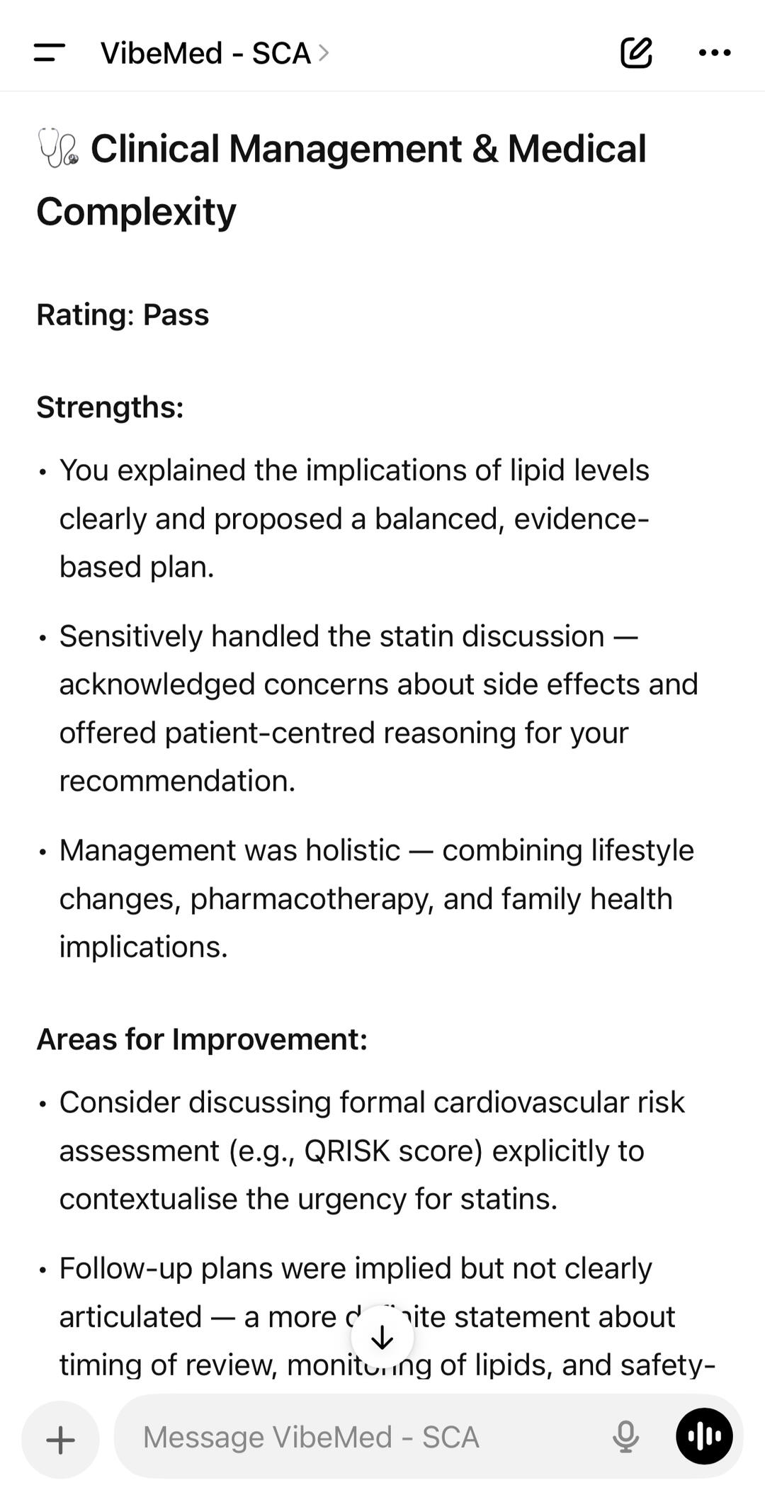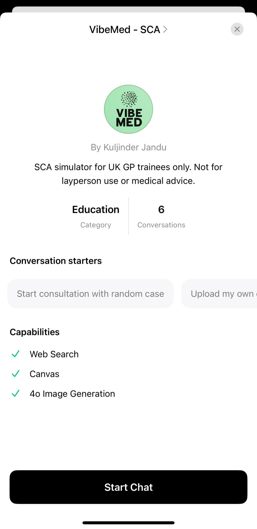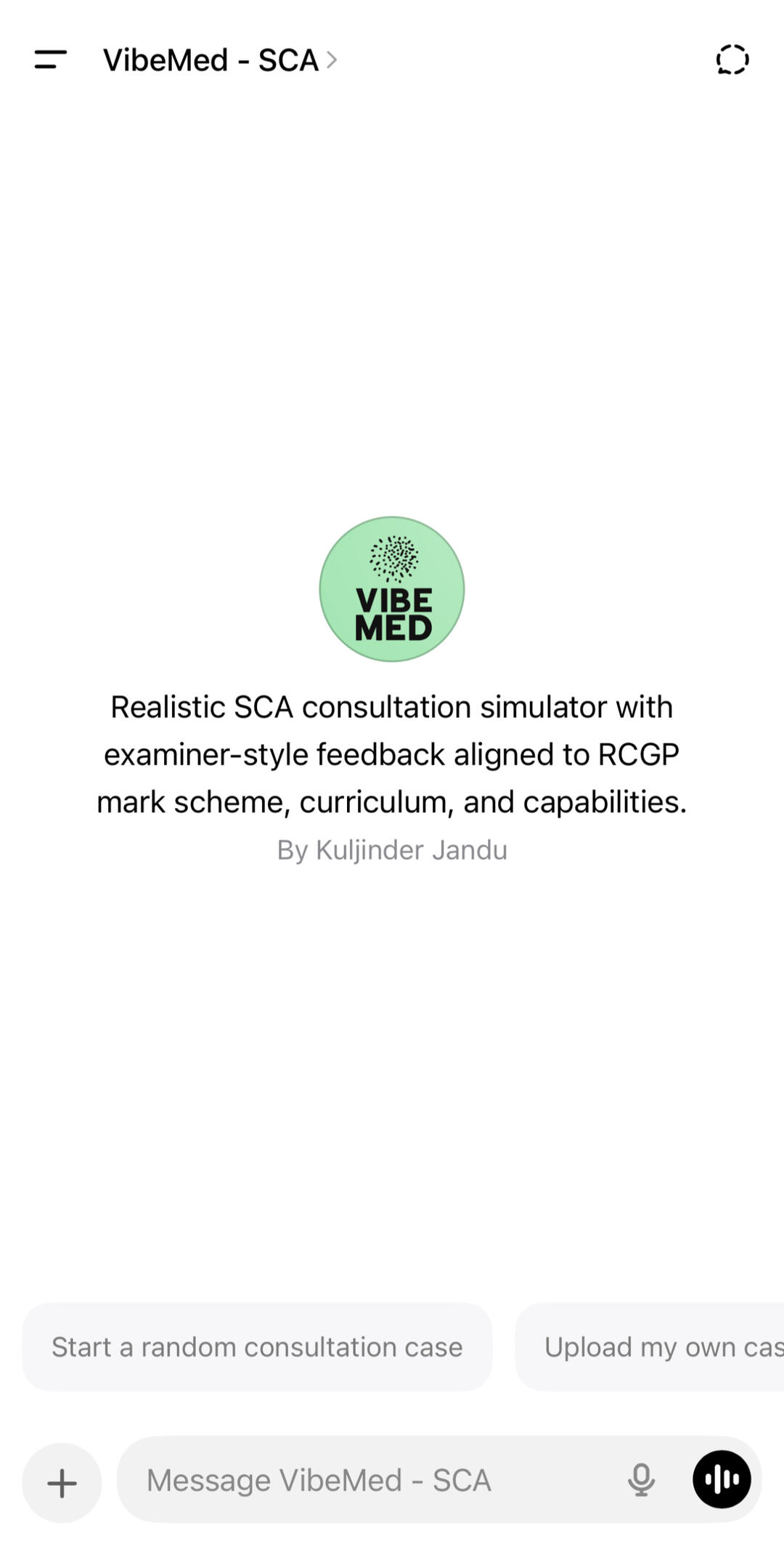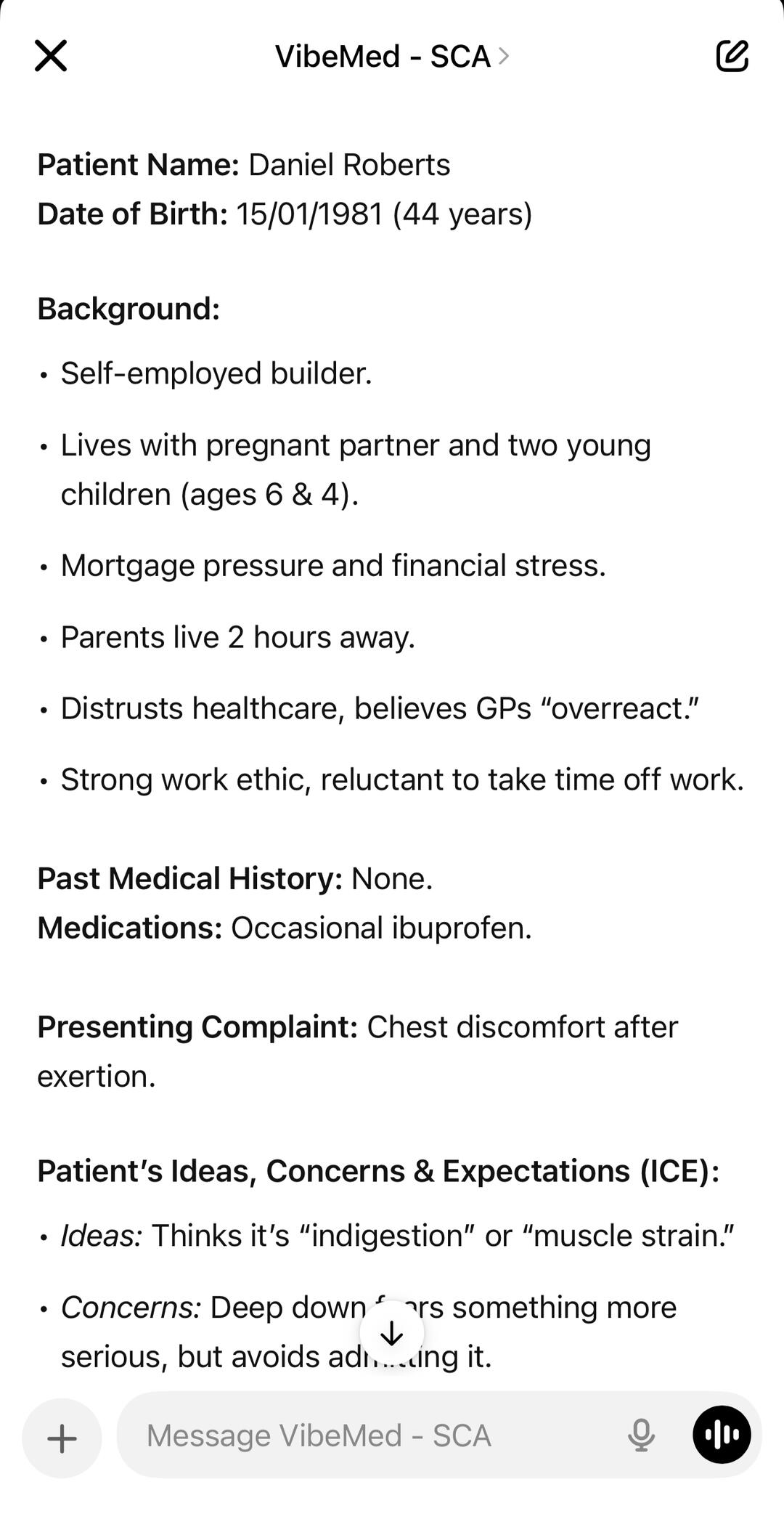 VibeMed SCA Simulator is an educational, fictional training tool designed to help UK GP trainees rehearse realistic consultations.
